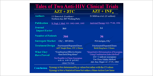 Example: Anti-HIV Clinical Trials: 2 drugs Combinations: One slide summary indicating drug combination clinical trial errors in design and in data analysis.